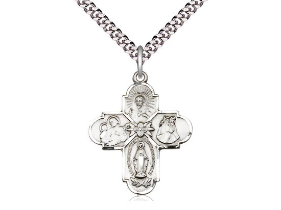 Sterling Silver 4-Way Pendant on a 24 inch Light Rhodium Heavy Curb Chain.