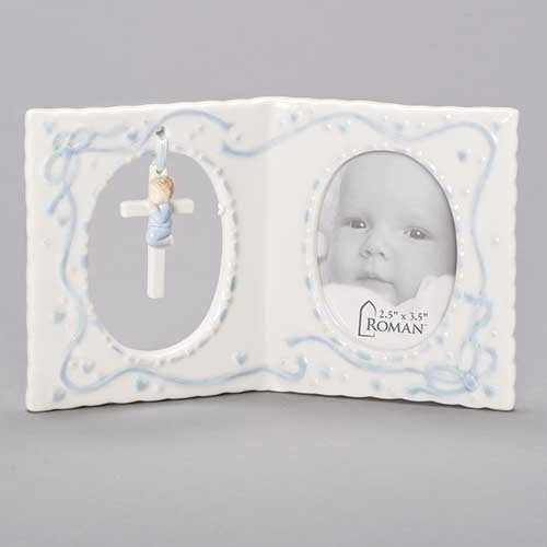 Baby Boy Frame with hanging cross. Double frame for tabletop. Frame for (1) 2.5" x 3.5" picture.
