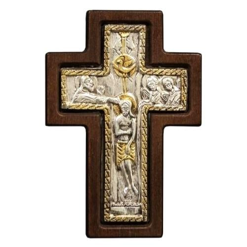 This blessings cross is engraved hard wood with sterling silver Baptism scene