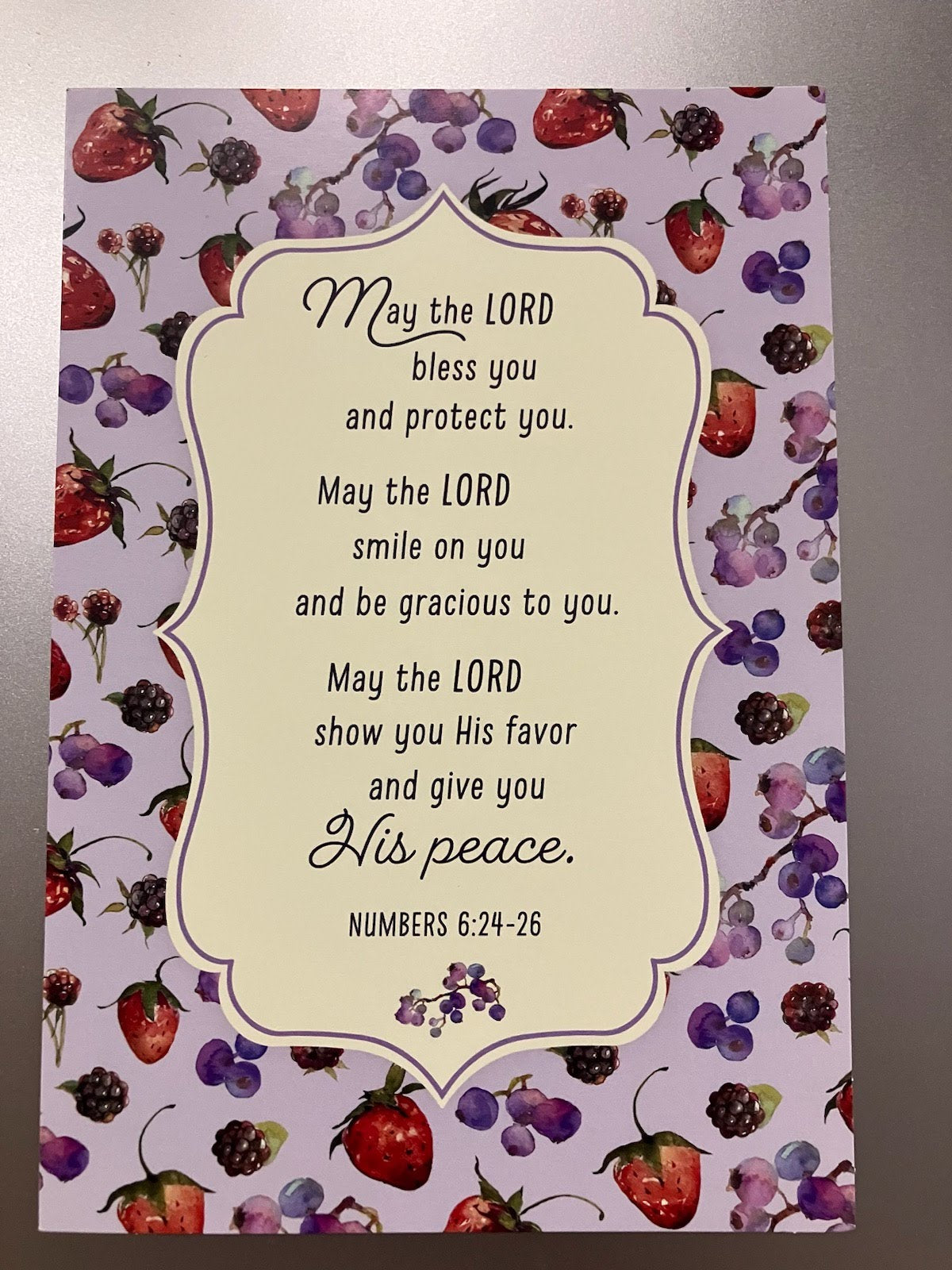 Front of the card reads: " May the Lord bless you and protect you. May the Lord smile on you and be gracious to you. May the Lord show you His favor and give you His peace. Numbers 6:24-26".