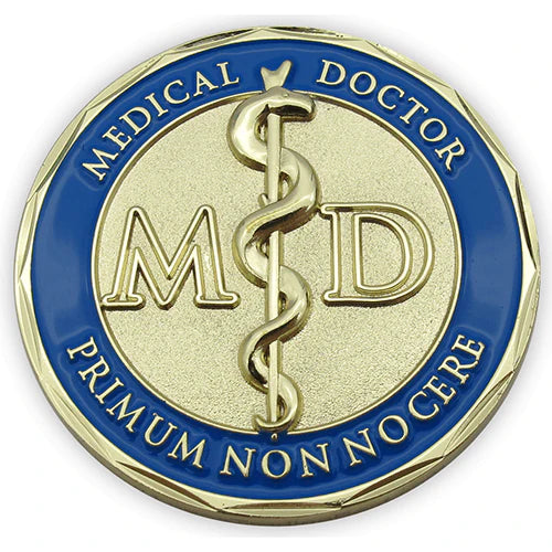 Front: On the front is the M.D. symbol, with text "Medical Doctor" / "Primum Non-Nocere" which is Latin for " First Do No Harm"