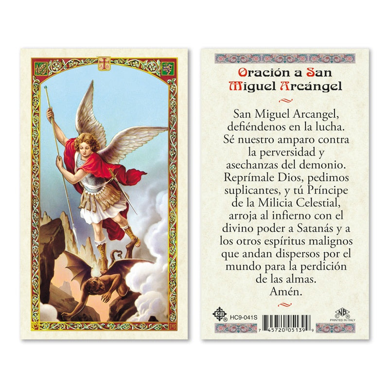 Holy card with prayer to St. Michael the Archangel in Spanish. Pictured showing the front and the back of the card. Priced for one holy card.
