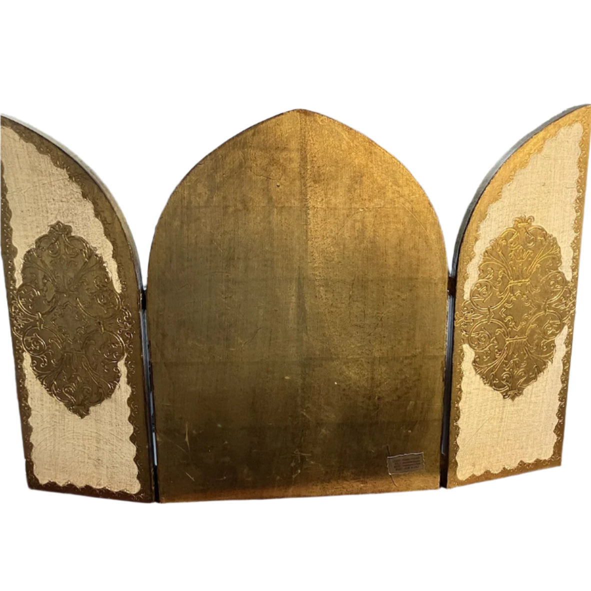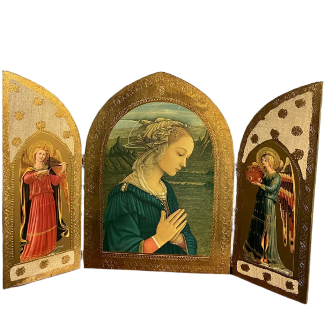 Beautiful 16 x 24" (when fully opened) Triptych of The Madonna and 2 Angels. Artist Filippo Lippi. Made in Italy. Gold Wood Arched Frame.