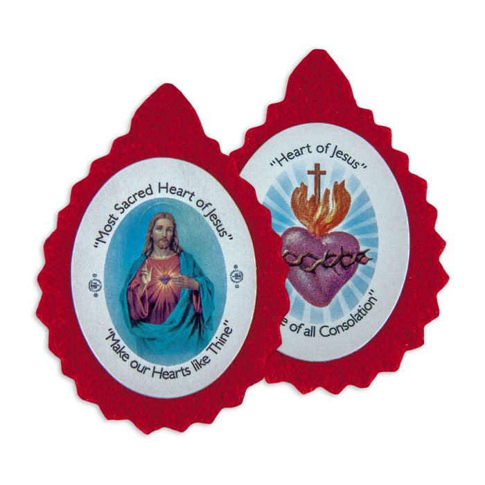 Red Felt Sacred Heart Badge. Pictured showing the front and back of the badge. Sold individually.