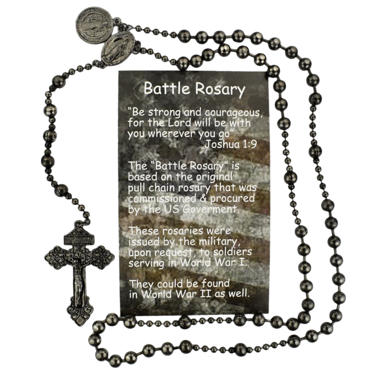 This rugged Battle Rosary features striking gunmetal black beads and a powerful St. Benedict medal, symbolizing protection and spiritual strength. Designed for durability and devotion, it comes with an informational card referencing the presence of the Battle Rosary in the World Wars. A meaningful gift for those seeking spiritual fortitude.