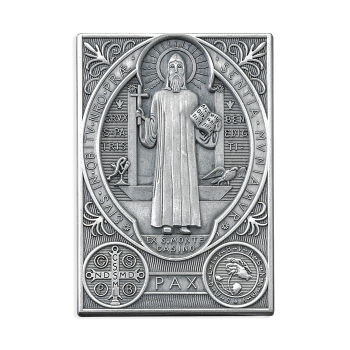 Saint Benedict Genuine Pewter with Antique Finish, Hand Engraved Auto Visor Clip. Individually Carded.
