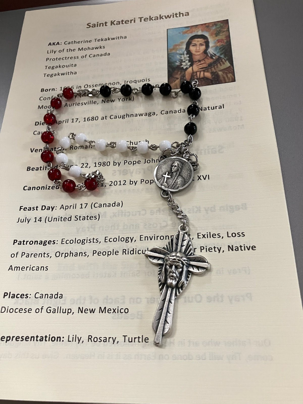 The chaplet comes with a prayer folder. Pictured is the front and the inside of the prayer folder. Priced for one chaplet and one folder.