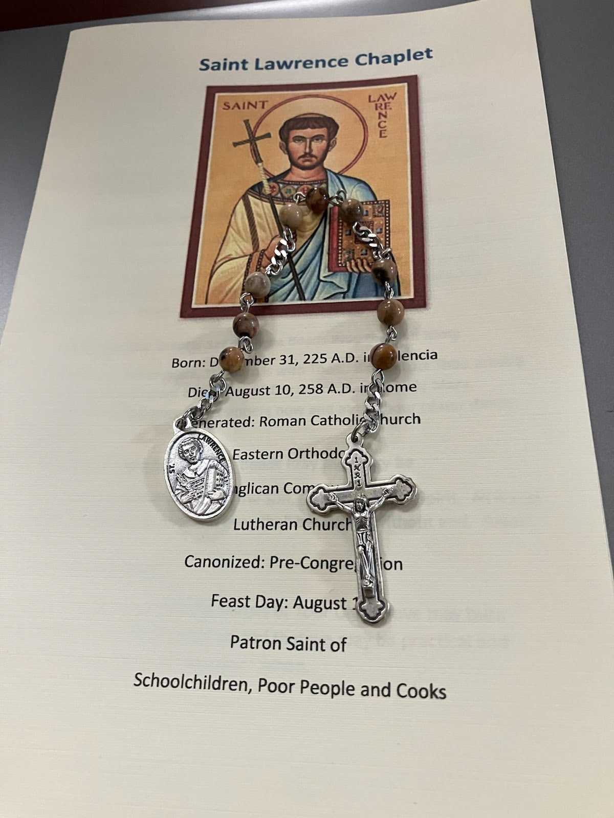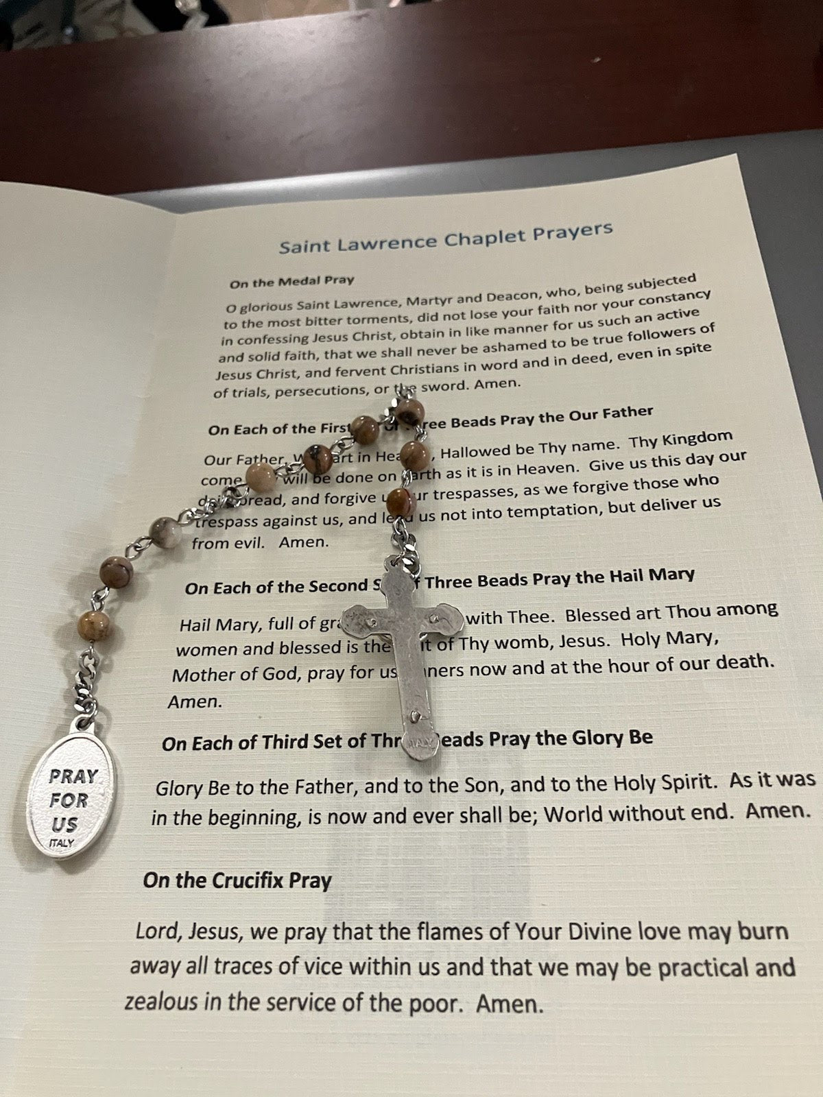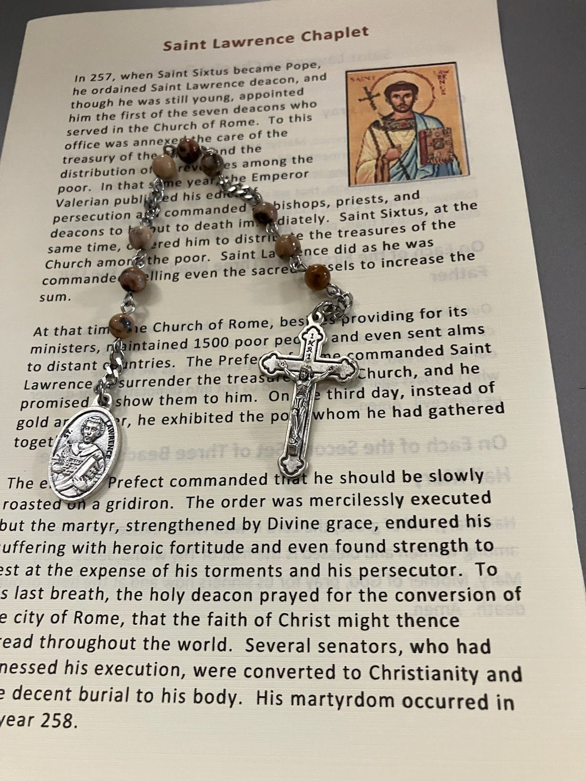 The chaplet comes with a prayer folder. Pictured is the front and the inside of the prayer folder. Priced for one chaplet and one folder. There are 2 different prayer folders. One has a short biography on the front cover and the other has highlights with larger picture.