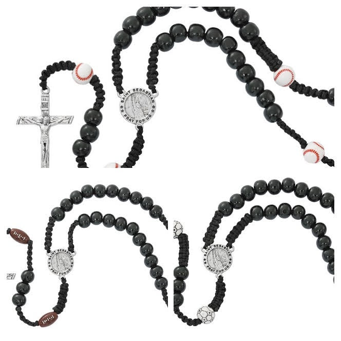 St. Sebastian, Sports, Black Wood Bead Corded Rosary (3 Variants)