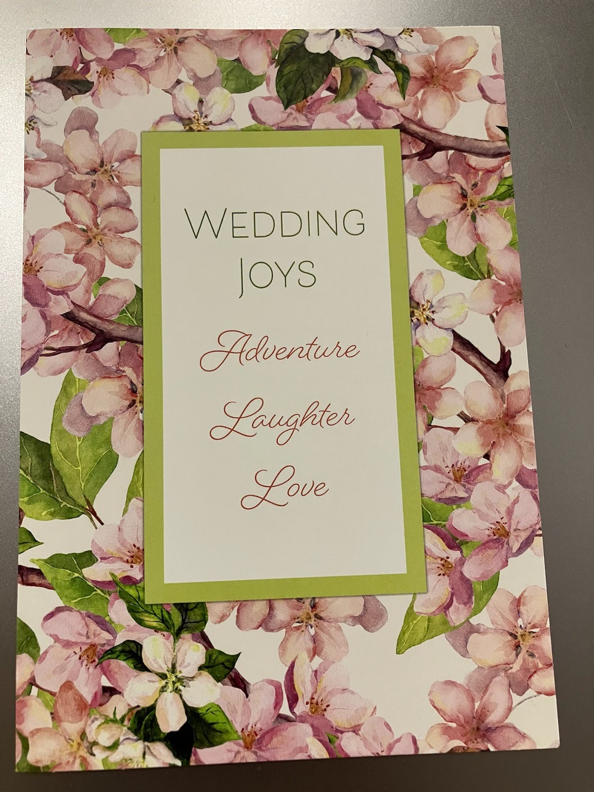 Front of the card reads: " Wedding Joys Adventure Laughter Love ".